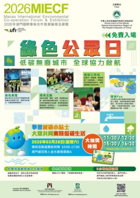 【本報消息】以「低碳無廢城市、全球協力啟航」為主題的「2026年澳門國際環保合作發展論壇及展覽」(2026MIECF”)將3月28日會期最後一天定為「綠色公眾日」,公眾可免費入場參與一系列環保宣教活動,透過MIECF平台了解最新環保資訊,推動實踐各種綠色低碳生活方式,共建無廢城市。為提升公眾環保意識,2026MIECF「綠色公眾日」繼續免費開放予公眾入場參觀綠色展覽,了解與日常生活息息相關的綠色...