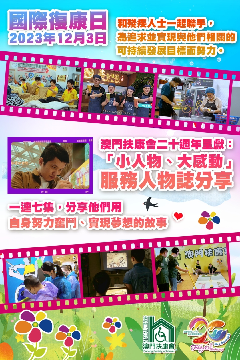 【本報消息】每年12月3日為聯合國所定的「國際復康日」,世界各地都會舉辦不同的活動推廣節日資訊。扶康會一如既往地通過各種方式推廣「均等機會,全面參與」的理念,包括推動公眾了解殘疾人士的真實生活和需要,消除對他們的誤解和偏見。