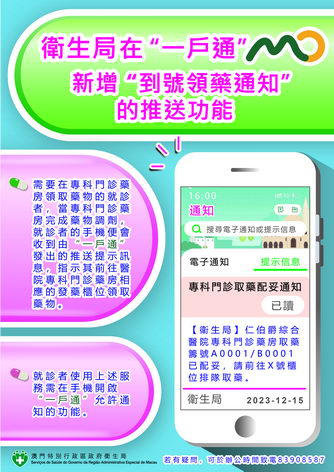 【本報消息】為配合特區政府電子政務發展,推動智慧醫療,優化就診者領藥服務體驗,衛生局仁伯爵綜合醫院專科門診藥房在一戶通新增「到號領藥通知」的推送功能。