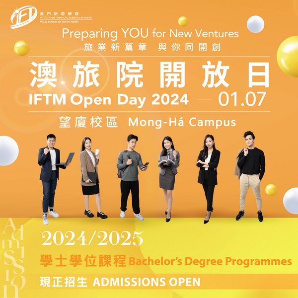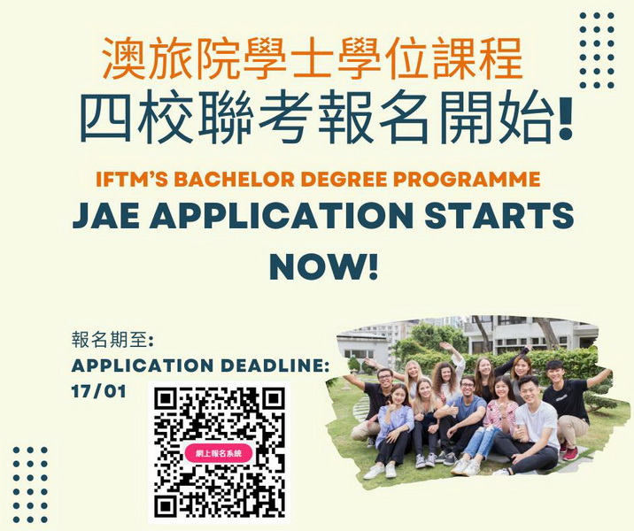 另外,旅院學士學位課程(英文學制及新增日間中文學制)現正接受四校聯考考生報名,報名期由即日起至1月17日,合資格新生可獲獎學金。詳情可瀏覽招生網頁 (www.iftm.edu.mo/admission )或掃描二維碼。