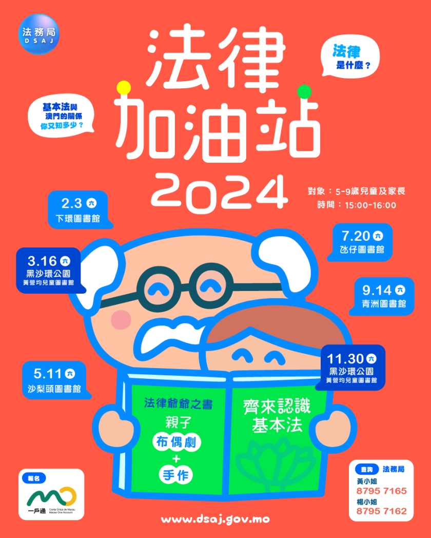 首場「法律加油站」將於2月3日下午三時至四時在下環圖書館舉行,歡迎本澳五至九歲兒童及家長參加,有興趣者可透過一戶通的活動報名頁面報名,每場名額八對親子,如報名人數超過數量,將以電腦抽籤方式決定。