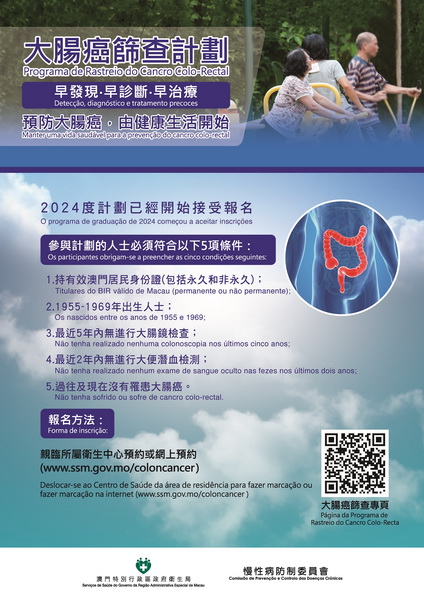 凡符合相關條件人士可由1月22日起登入大腸癌篩查專頁(www.ssm.gov.mo/coloncancer)進行網上預約及了解更多大腸癌及篩查計劃資訊,亦可親臨所屬衛生中心預約諮詢服務。