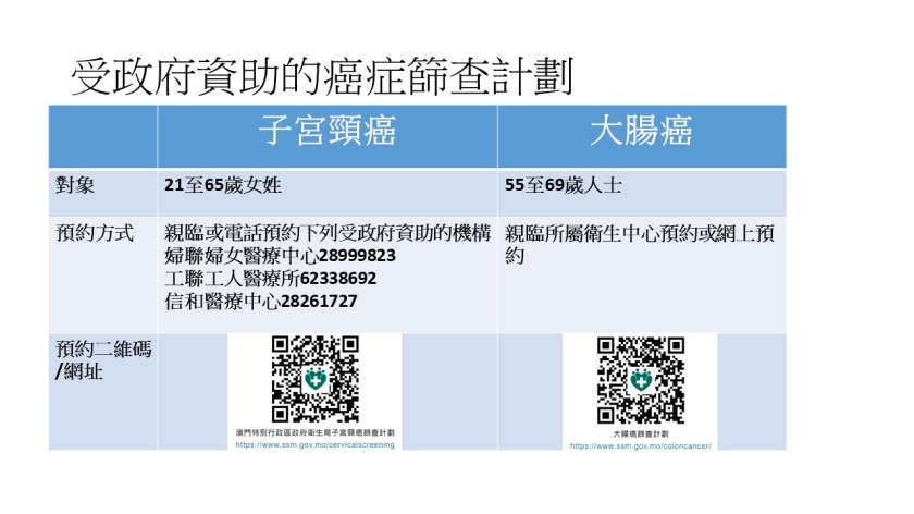 此外,衛生局自2016年起推出大腸癌篩查網上預約服務,為便利居民和減少輪候時間,衛生局與私營醫療機構合作,資助潛血陽性的參加者到本澳醫療機構進行大腸鏡檢查,計劃至今完成2.3萬人次篩查,其中因潛血陽性需要做腸鏡的有2,462人,總共篩查出139例大腸癌患者並及時安排跟進治療。