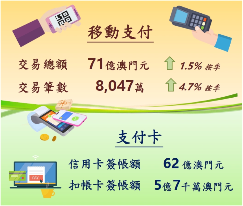 本地移動支付工具於2023年第四季的交易筆數為8,047萬宗,按季上升4.7%;交易總額為71億澳門元,按季增加1.5%,每筆交易的平均金額為88.6元。截至2023年底,本地受理移動支付的機具及二維碼立牌數量為102,178個,較同年九月底增長2%。