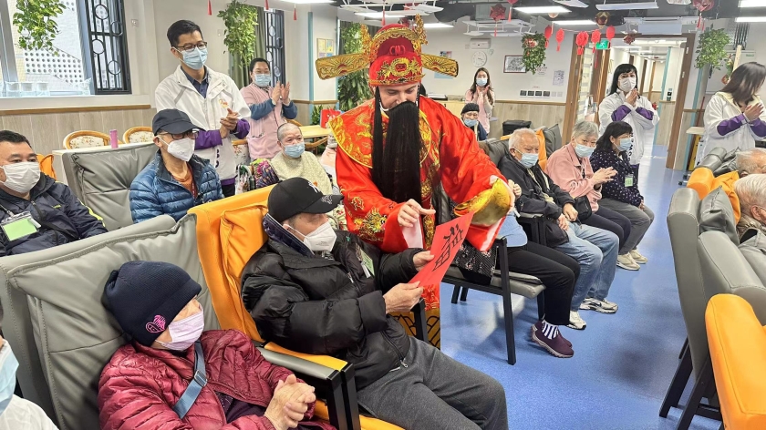 澳電愛心大使由明暉負責人帶領參觀中心設施及日常運作後,並在活動室與長者唱歌玩遊戲,以音樂及互動遊戲瞬間破冰;澳電同事裝扮的龍年財神更率領愛心大使走入病房探訪卧床長者,送上手寫揮春祝願大家身體健康、精神爽利。