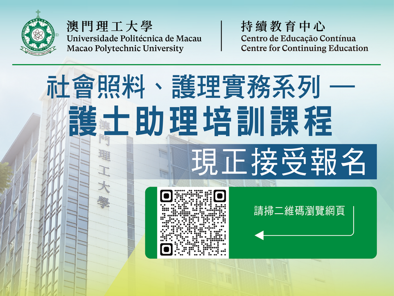 【本報消息】隨著社會發展,大健康行業對於專業人才的需求穩步提升。配合需求,澳門理工大學持續教育中心今年將開辦「第二屆護士助理培訓課程」,為有志投身健康照顧行業的人士提供系統性的培訓。課程獲政府衛生局支持,現正接受報名,報名期至2月28日。