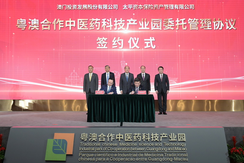 在行政長官賀一誠,中聯辦主任鄭新聰等見證下,澳門投資發展主席吳建峰與太平資本保險資產管理總經理吳松代表雙方簽署《粵澳合作中醫藥科技產業園委托管理協議》,正式建立委托管理關係,共同推進產業園提升服務品質,加快產業聚集。