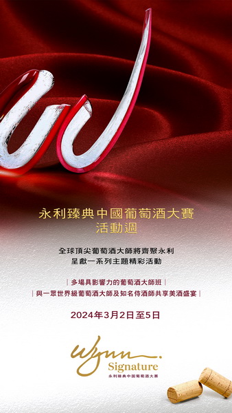 屆時來自中國近200家酒庄的中國釀造頂級葡萄酒將角遂榮耀,是全球最大型採用國際標準針對評審中國葡萄酒的大賽。參賽酒莊將角逐「年度最佳中國葡萄酒」及其他29個表彰卓越品種和優秀產區的獎項。在為期五天的評審活動中,永利將呈獻由著名的葡萄酒專家和作家主持的葡萄酒大師班,以及與世界知名評審和行業權威專家共同策劃的美食饗宴等精彩體驗。