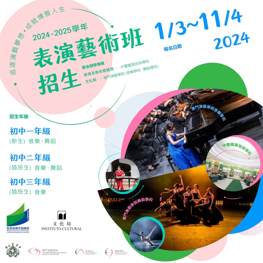 【本報消息】由教育及青年發展局與文化局聯合開辦的表演藝術課程,招收2024/2025學年初一年級新生、初二及初三年級插班生,並由即日起至4月11日接受報名。課程由教青局轄下中葡職業技術學校聯合文化局轄下澳門演藝學院開辦,整合資源優勢,協同培養澳門表演藝術人才。