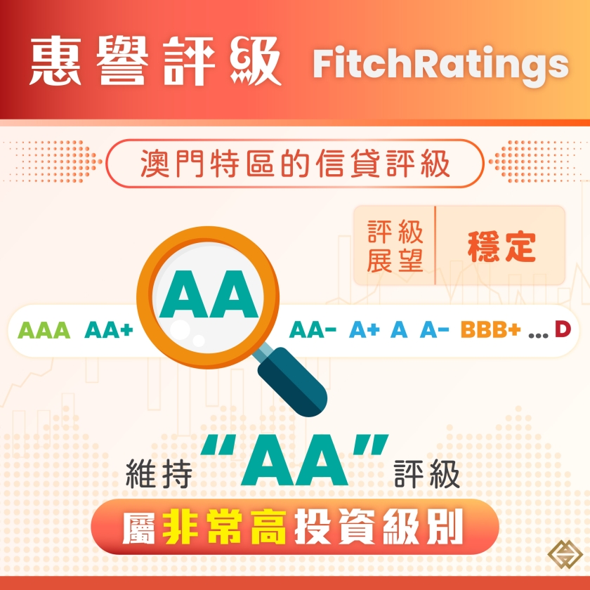 惠譽維持澳門特區屬於第三高級別的「AA」評級,主要是基於特區非常穩健的財政和對外收支狀況,以及政府在經濟調整期仍堅守審慎的財政管理。與此同時,惠譽預期穩定的旅遊業復甦和非博彩投資將對澳門的經濟前景提供支持。