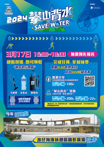 為吸引本澳不同社區的居民參與節水活動,擴大節水宣傳效力,今年攀山背水移師氹仔海濱休憩區圓形廣場和步行徑舉行。活動無需預先報名,且不設名額限制,參加者於活動當日現場可獲得海事局贈送的「2024攀山背水」裝備,包括手機帶、毛巾、斜揹包和支裝水,禮物先到先得,派完即止。現場也設有與水資源相關的攤位遊戲和展板,讓公眾在體驗揹水之旅之餘,也可了解到澳門的水資源狀況,寓教於樂。