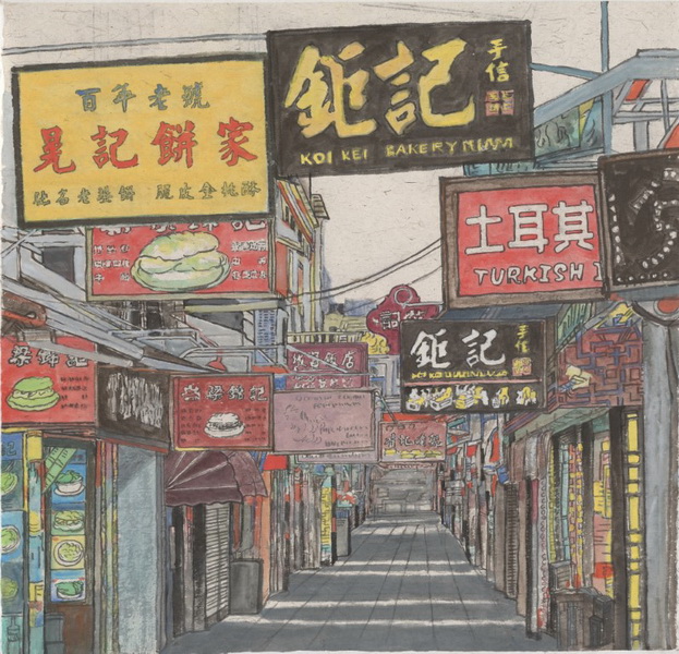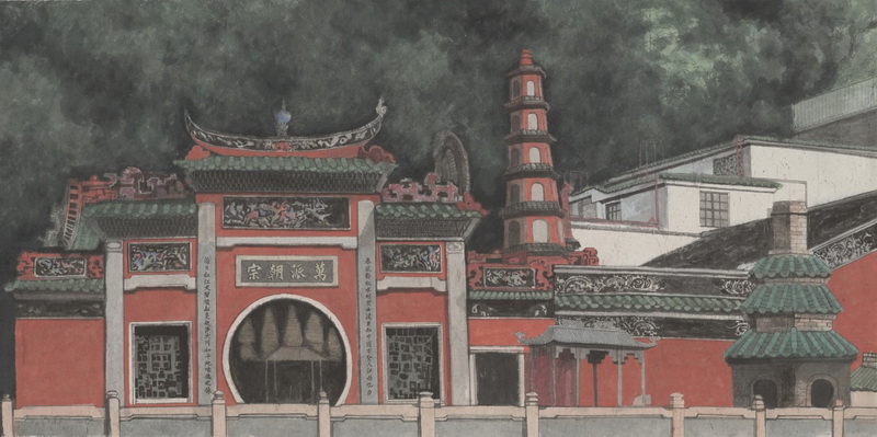 作為一名文化學者,潘魯生多年來致力於探尋民間文化傳承之路。對他而言,大灣區總是有着無盡的文化魅力,這方水土已成為他洞悉與觀察世界文化發展趨勢的一扇視窗。近年來,他在灣區開展田野調研,走訪手藝人,臨景寫生,足跡遍佈了大灣區城鄉的各個角落。他從熙攘的老街巷中,體味着時代發展的脈絡;他於盛大的祭祖儀式中,領悟到了香火相續的綿延;他在都市湧動的人流中,感知到了文化鄉愁的寄託。這一切凝視與沉思,都濃縮到了彩墨藝術的表達之中。