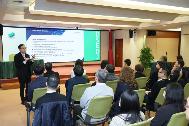周慶邦介紹了現時教育發展的變化,亦分享了香港學術及職業資歷評審局在推動高等教育發展的角色變化,由過去偏重學術評審,轉變為加強與高等院校的溝通、協作關係,近年逐漸成為香港政府及高等院校之間的橋樑。他並在會上簡介了近年香港學術及職業資歷評審局進行的一系列教育政策研究,如將應用型的資歷涵接至高等教育學歷等,為高等院校發展方面提供優化意見,以便院校配合社會需要調整未來發展定位及中、長期發展規劃等,助力院校優化辦學條件。