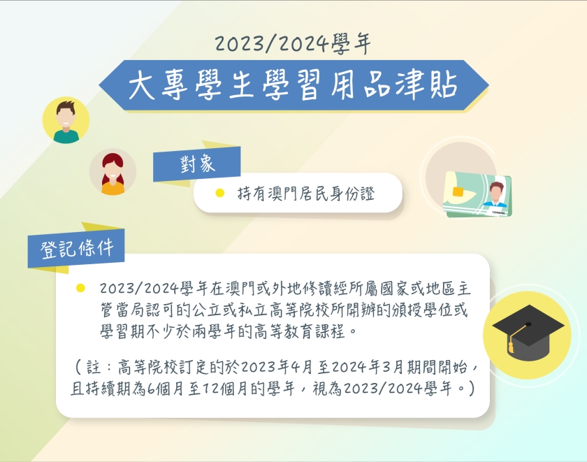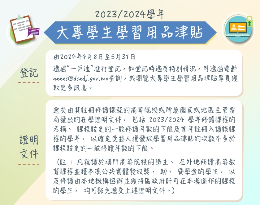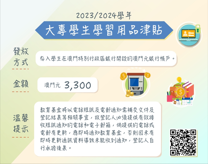 【本報消息】教育基金2023/2024學年大專學生學習用品津貼於由4月8日起至5月31日期間接受登記,符合津貼發放條件的大專學生可獲發3,300澳門元學習用品津貼。