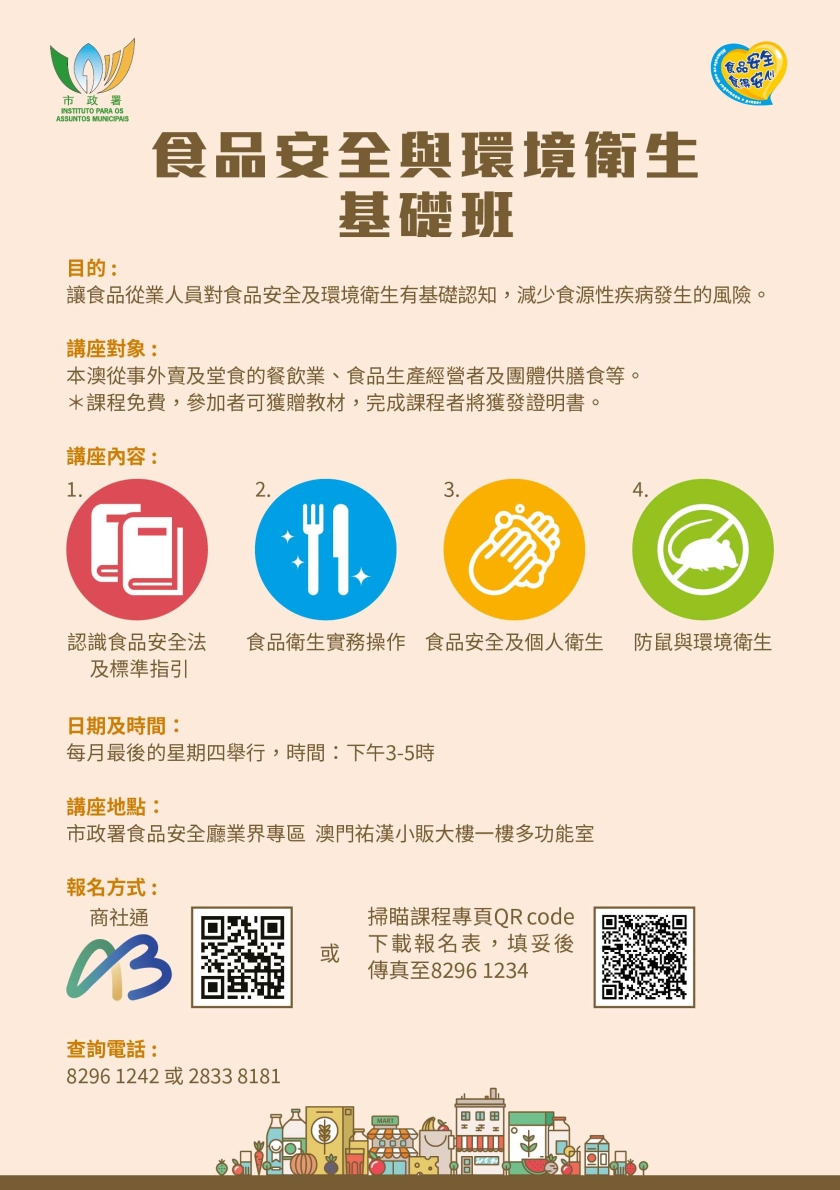 【本報消息】為提升食品業界對食品安全的認知及衛生水平,市政署每月開辦「食品安全與環境衛生基礎班」。四月份課程將於25日舉行,講授《食品安全法》、食品生產經營操作指引及衛生管理知識等內容。課程約兩小時,費用全免,完成課程者可獲發證明書,歡迎業界踴躍報讀。
