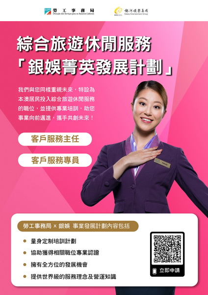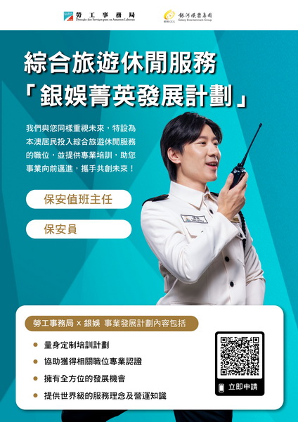 【本報消息】為支持本地人才全面發展,拓展多元職涯路向,勞工事務局和銀娛合作推出「銀娛菁英發展計劃(綜合娛樂服務範疇)」及「銀娛菁英發展計劃(保安服務範疇)」,以「先入職、後培訓」方式,為有志投身綜合旅遊休閒服務行業的澳門居民提供全方位培訓及事業發展機會,計劃由4月17日起接受申請。