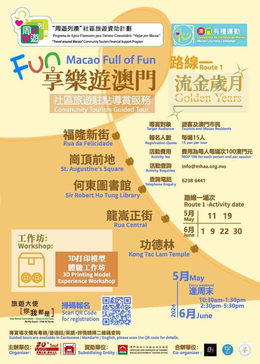 同時,旅遊局也持續透過資助計劃,鼓勵澳門社團舉辦多元化旅遊活動或項目,帶動社區經濟。旅遊局於五月份資助社團推出的活動括「FUN享樂遊澳門—社區旅遊駐點導賞服務」由即日起至6月30日期間一連九個周六日共辦36場導覽。活動設三條路線,包括「流金歲月」、「海岸憶舊」和「漫遊關前」。