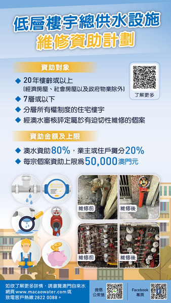 「低層樓宇總供水設施維修資助計劃」的資助對象為樓齡20年或以上、樓高七層或以下,且總供水設施出現爆裂、滲漏或嚴重鏽蝕等情況的分層所有權制度樓宇業主。自來水承擔總工程費用80%,餘下20%由業主或住戶攤分,每宗個案獲資助金額上限為五萬元。計劃詳情可透過自來水微信公眾號、Facebook專頁及官網查閱。如有疑問可致電客服熱線2822 0088查詢。