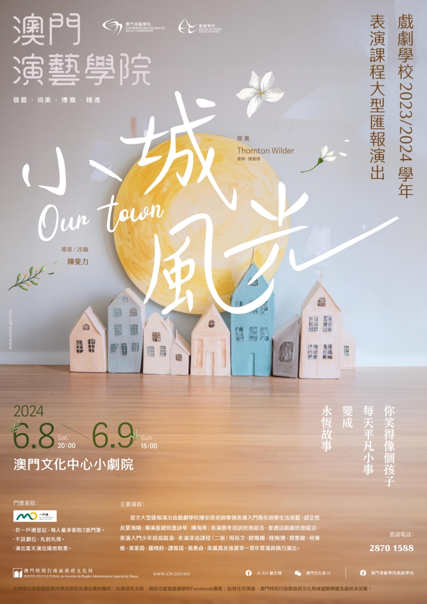 【本報消息】文化局轄下澳門演藝學院戲劇學校將於6月8日(星期六)晚上八時及6月9日(星期日)下午三時在澳門文化中心小劇院舉行大型匯報演出《小城風光》。