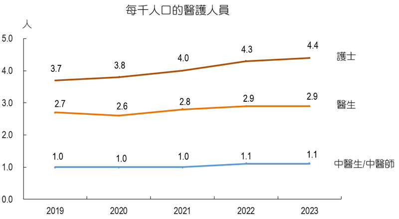 【本報消息】統計暨普查局最新統辯資料顯示, 截至2023年末本澳註冊醫生共1,980名、中醫生/中醫師728名及護士2,980名,按年分別增加15名、四名及117名;相當於每千人口對應2.9名醫生和1.1名中醫生/中醫師,兩者均按年持平,至於每千人口對應4.4名護士則按年增加0.1名。