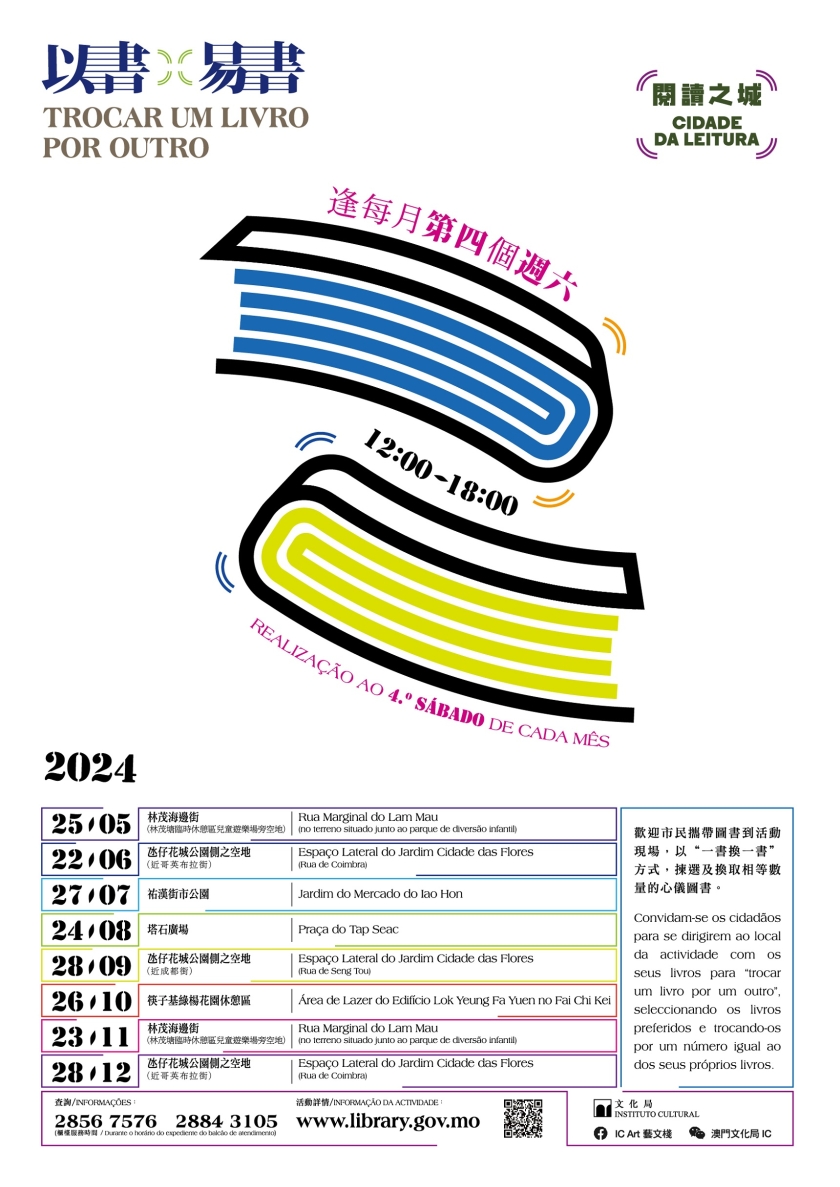 未來「以書易書」活動包括5月25日林茂海邊街(林茂塘臨時休憩區兒童遊樂場旁空地)、6月22日氹仔花城公園側之空地(近哥英布拉街)、7月27日祐漢街市公園、8月24日塔石廣場、9月28日氹仔花城公園側之空地(近成都街)、10月26日筷子基綠楊花園休憩區、11月23日林茂海邊街(林茂塘臨時休憩區兒童遊樂場旁空地)及12月28日氹仔花城公園側之空地(近哥英布拉街);時間為舉辦當日中午12時至下午六時。