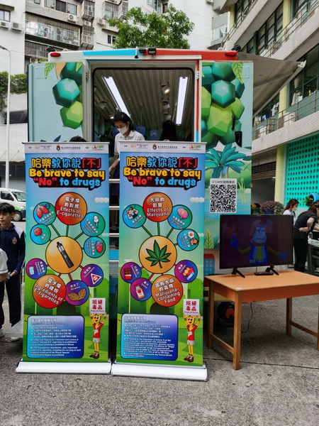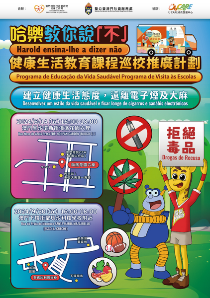 【本報消息】由聖公會澳門社會服務處主辦,社會工作局贊助的「哈樂教你說不」預防藥物濫用宣傳推廣活動於5月10日率先在聖公會中學(澳門)進行,是項活動透過Ü CARE共享巴社區流動服務車,以短片、展板、攤位遊戲等活動方式,將健康生活模式、電子煙及大麻的危害於英文學校及社區內進行宣傳活動,期望以趣味及吸引的方法傳遞禁毒訊息,加強公衆對健康的關注。