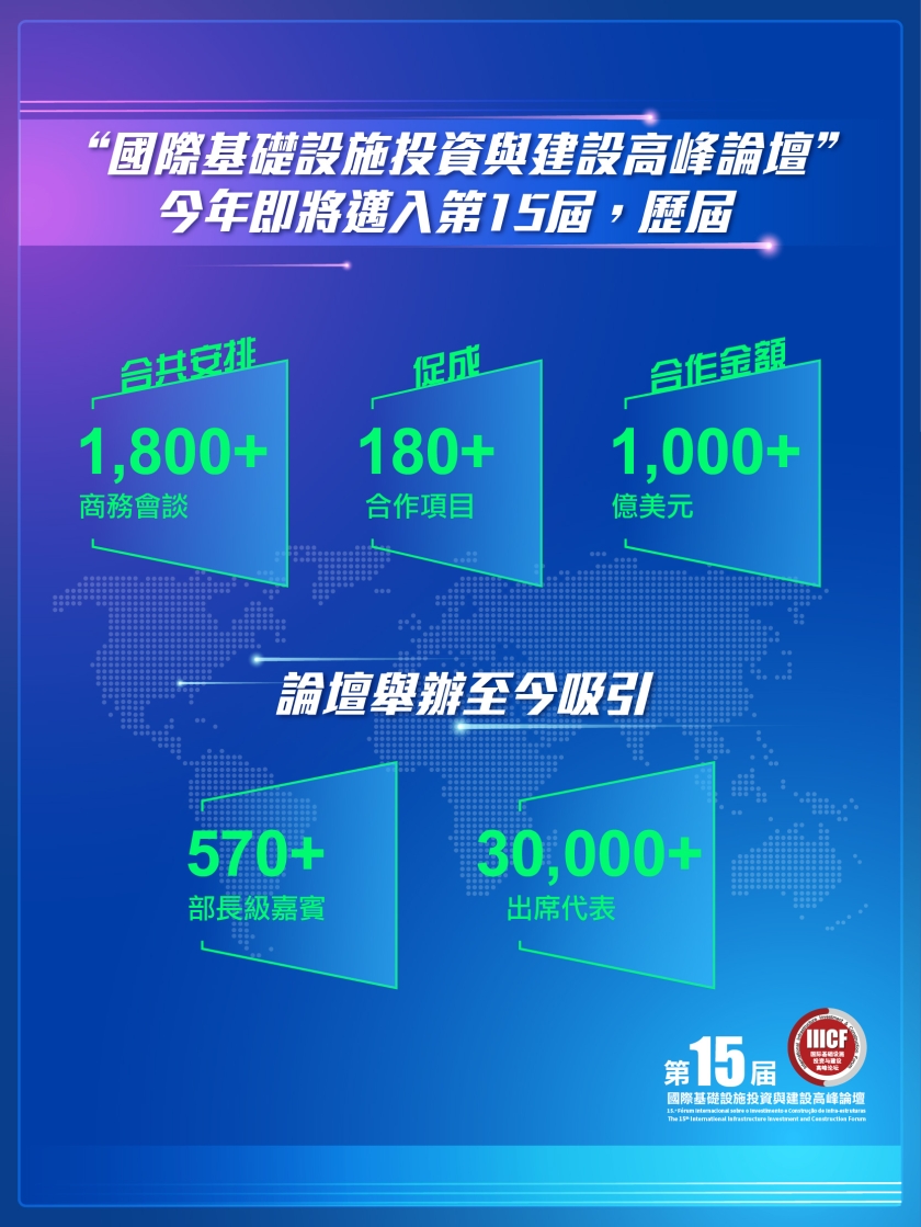 於2010年經國家商務部批准創辦的「國際基礎設施投資與建設高峰論壇」,2012年起在澳門舉行,持續用好國家賦予澳門作為中國與葡語國家商貿合作服務平台的優勢,以及澳門世界級的辦展辦會資源。歷屆累計吸引三萬多名基建行業精英出席,安排1,800多場商務會談,促成180多個合作項目,合作金額逾一千億美元。