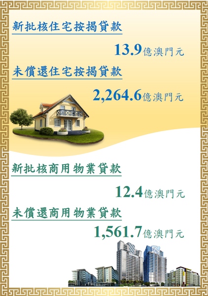 由於期內數筆大額貸款已清還,未償還商用物業貸款總額按月下跌1%至1,561.7億元,與一年前比較減少3.4%;其中,居民部分佔93.4%。居民及非居民部分的未償還商用物業貸款按月同告下跌1%。