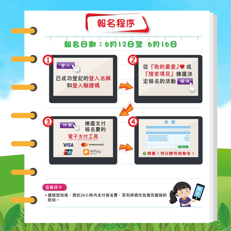 主辦單位提醒報名者在報名前,須備妥電子支付工具繳費,宜提前瀏覽課程資訊和將心儀的活動加入「我的最愛」,以及準備好已成功登記的登入名稱和登入驗證碼,以便完成網上報名。
