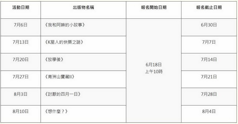每場活動以不同的兒童文學故事作為主軸,包括《我和阿嫲的小故事》、《K星人的快樂之謎》、《放學後》、《青洲山寶藏II》、《討厭的四月一日》和《想什麼?》導師透過生動有趣的方式演繹作品內容,配合不同的遊戲、音樂及互動環節讓參加者投入,暢遊在故事及文字中,同時設有與主題有關的寫作練習,啟發孩子的想像力,輕鬆實現寫作。