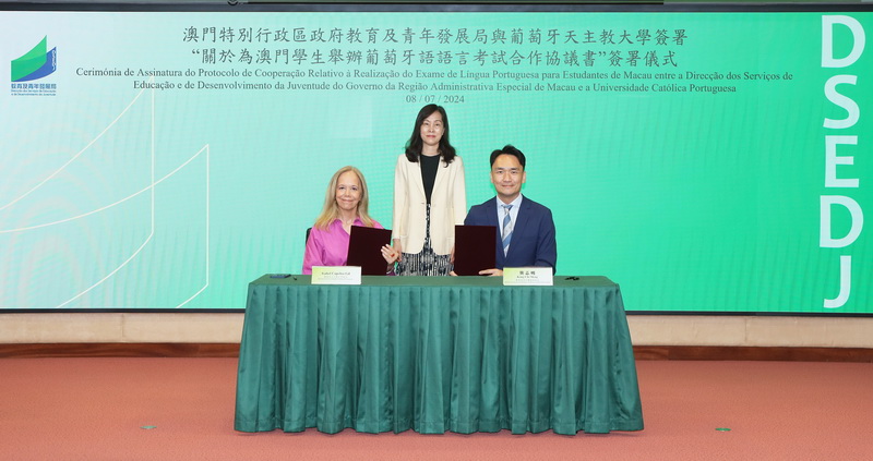 【本報消息】為進一步推動澳葡兩地教育合作,培養中葡雙語複合型人才,教育及青年發展局與葡萄牙天主教大學7月8日簽署《關於為澳門學生舉辦葡萄牙語語言考試合作協議書》,旨在為具備一定葡語能力的澳門學生創設更便捷的赴葡升學渠道,增加其升讀學科學位課程的選擇。