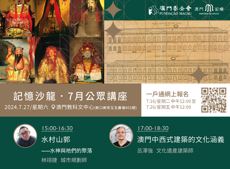 澳基會將在7月27日下午於澳門教科文中心推出兩場「記憶沙龍」公開場,分別由城市規劃師林翊捷主講的「水村山郭—水神與祂們的聚落」和文化遺產建築師呂澤強主講的「澳門中西式建築的文化涵義」。
