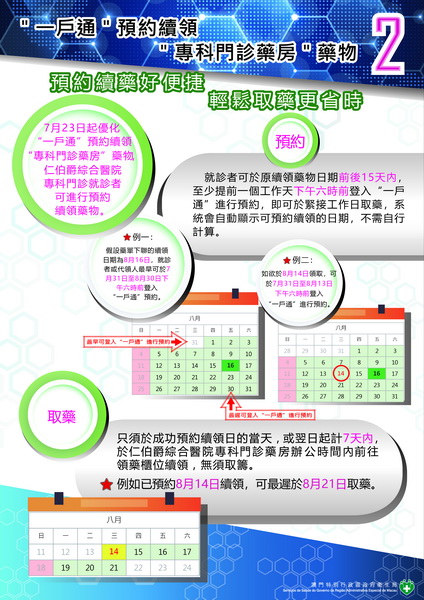 【本報消息】為配合特區政府電子政務發展,推動智慧醫療,進一步便利就診者或代領人領取仁伯爵綜合醫院專科門診藥物和縮短輪候領藥時間,衛生局於7月23日起優化一戶通預約續領「專科門診藥房」藥物服務。