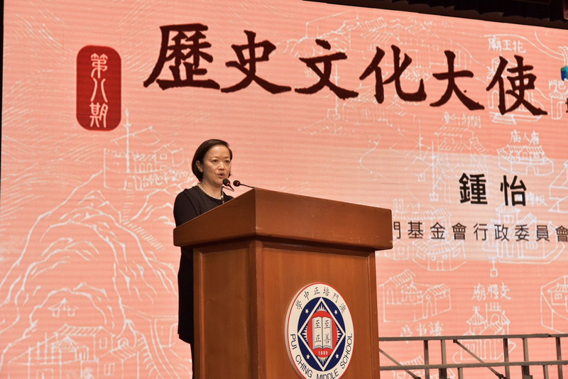 澳基會行政委員會代主席鍾怡致辭時表示,澳門作為粵港澳大灣區內以中華文化為主流、多元文化共存的交流合作基地,在弘揚 「澳門歷史城區」 世界遺產的突出普遍價值,有賴社會各界的共同協作和努力。特別是作為未來社會棟樑的青年學生們,更有責任向他們傳承中華優秀傳統文化和澳門獨特文化價值。計劃自2018年起與澳門歷史教育學會合辦,至今已舉辦八期,有近千名師生和居民報讀,培育出的種子學生和種子青年,在弘揚澳門傳統的人文關懷,以及培養熱愛家國的歸屬情感方面,都起到積極的帶頭作用。她寄語學員們能成為真正的歷史文化大使,將澳門歷史文化的優良傳統一代一代地傳承下去。