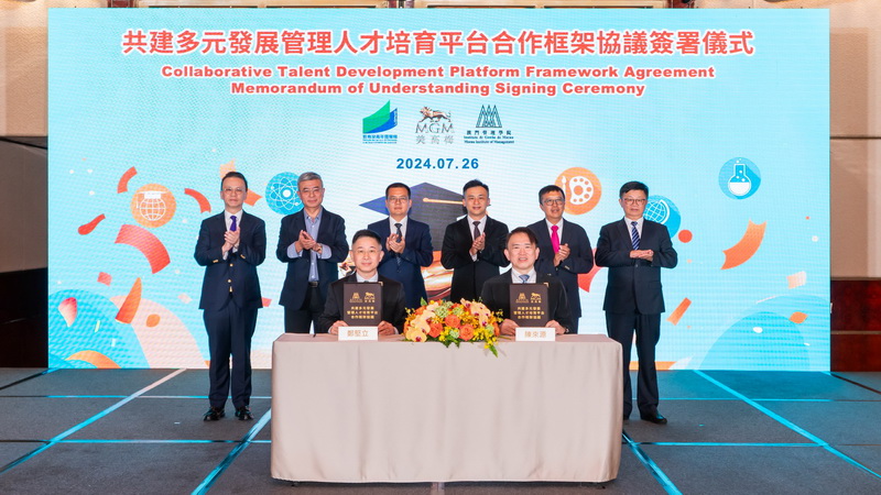 同場,美高梅更與澳門管理學院簽署《共建多元發展管理人才培育平台合作框架協議》,將為期四年的學士學位課程引進公司内部授課,是首家與本地院校合作推出學士學位課程的綜合旅遊休閒企業,進一步為團隊成員搭建學業階梯。