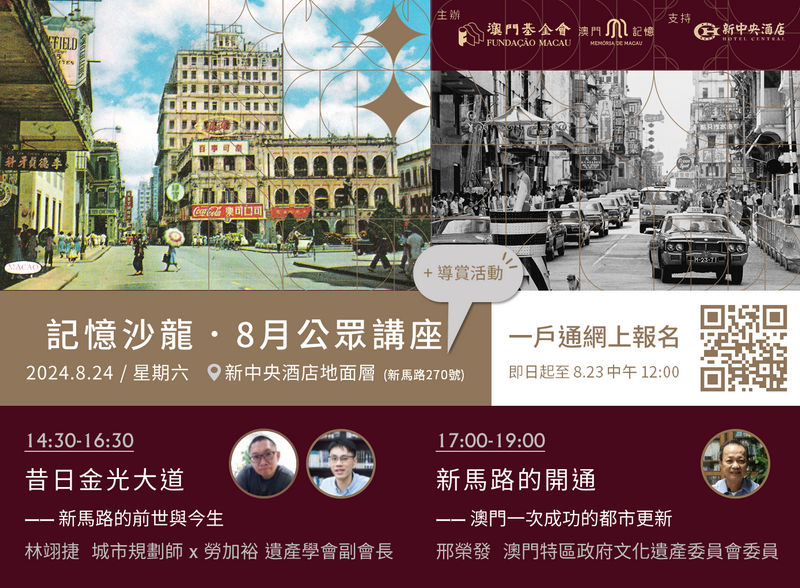 澳門基金會的「澳門記憶」文史網聯乘澳門新中央酒店,將於8月24日舉行兩場「記憶沙龍」 講座特別場,與大眾一起認識新馬路的前世今生,並結合導賞活動,共同來一趟「浮光百年」的時間旅程。