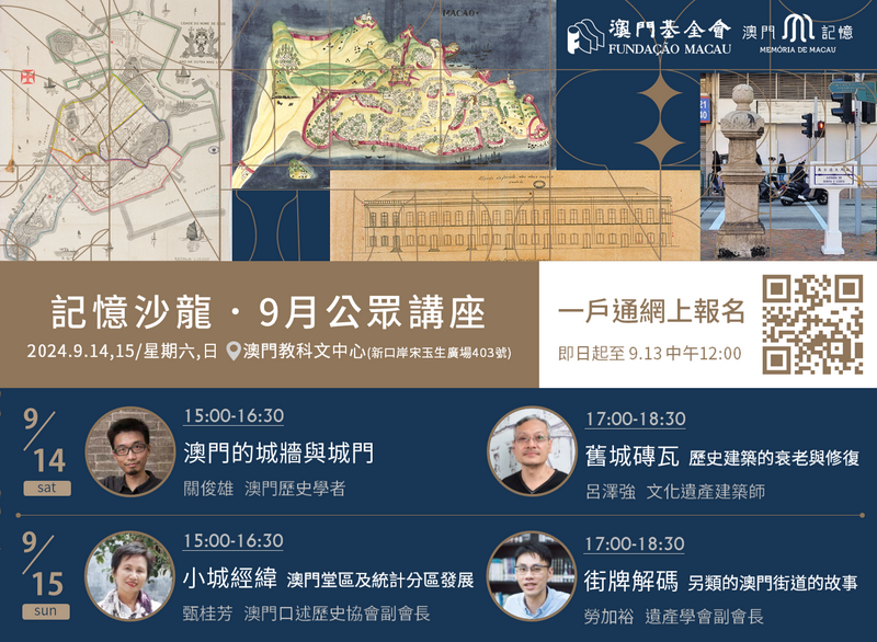 與此同時,「記憶沙龍」亦於9月14及15日下午在澳門教科文中心舉行,將送上四場不同主題的歷史文化講座,分別由關俊雄主講「澳門的城牆與城門」、甄桂芳主講「小城經緯—澳門堂區及統計分區歷史發展」、呂澤強主講「舊城磚瓦—歷史建築的衰老與修復」以及勞加裕主講「街牌解碼—另類的澳門街道的故事」,現正於一戶通中開放報名 ,9月13日中午12時截止。誠邀市民與親友一同到場參與,在書香中感受小城歷史,查詢可於辦公時間內致電8797 8565。