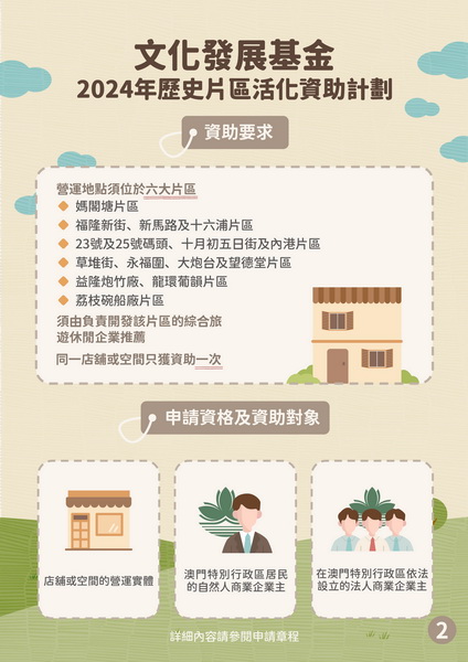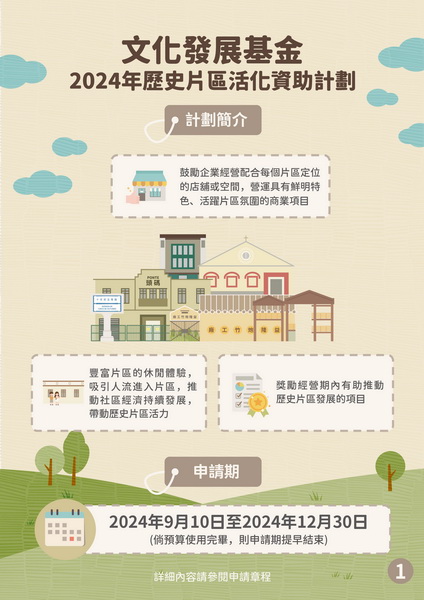 【本報消息】文化發展基金將於9月10日至12月30日接受「2024年歷史片區活化資助計劃」的申請,鼓勵企業經營配合每個片區定位的店舖或空間,營運具有鮮明特色、活躍片區氛圍的商業項目,帶動歷史片區活力,同時獎勵經營期內有助推動歷史片區發展的項目。