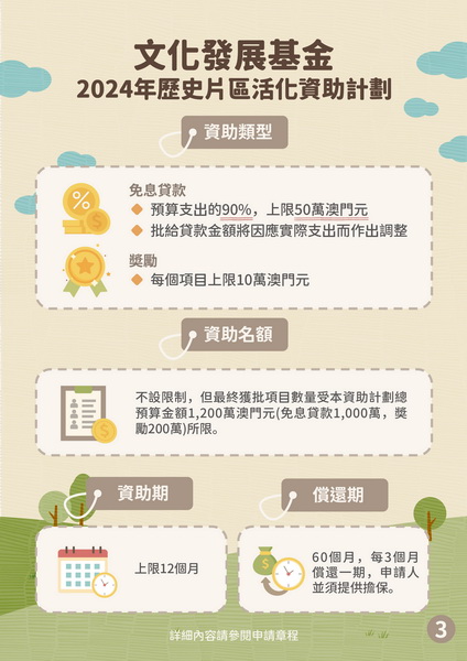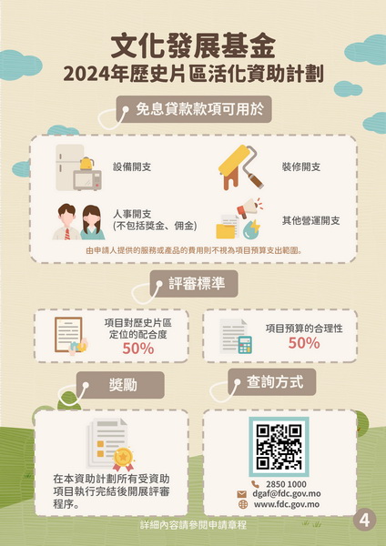 為詳細介紹「2024年歷史片區活化資助計劃」的申請事宜及解答申請人問題,基金將於10月3日下午三時假誠豐商業中心七樓演講廳(宋玉生廣場322-362號)舉行專場講解會,有興趣人士可登入基金網站(www.fdc.gov.mo)「電子服務及資訊下載區」的「報名登記系統」內報名,查詢請致電2850 1000或電郵dgaf@fdc.gov.mo。