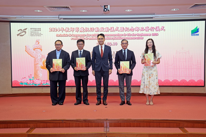 2024年教師節慶祝活動啟動儀式暨紀念郵品發行儀式、喜迎雙慶教師節海報及漫畫作品展開幕禮於9月10日上午舉行,教青局局長龔志明、中聯辦教育與青年工作部副部長李勇先、郵電局行政委員會委員孫君煬、教青局副局長丁少雄、阮佩賢、黃嘉祺、澳門中華教育會理事長鄭洪光、澳門高等教育發展促進會會長莫啟明、澳門天主教學校聯會會長周伯輝、澳門公職教育協會理事長香梅、教育委員會委員、教學人員專業委員會委員、高等院校代表及非高等教育學校代表等出席活動。