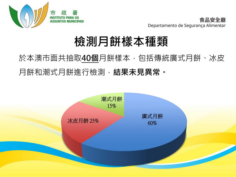 本次抽檢的40個月餅樣本包含傳統廣式月餅、冰皮月餅及潮式月餅,進行了微生物學和化學檢測,當中包括沙門氏菌屬、單核細胞增生李斯特氏菌、金黃色葡萄球菌、防腐劑和黃曲霉毒素B1。此外,針對含有蛋黃的月餅樣本,亦加驗了食品中禁用物質蘇丹紅。根據化驗結果,所有月餅樣本均未見異常。