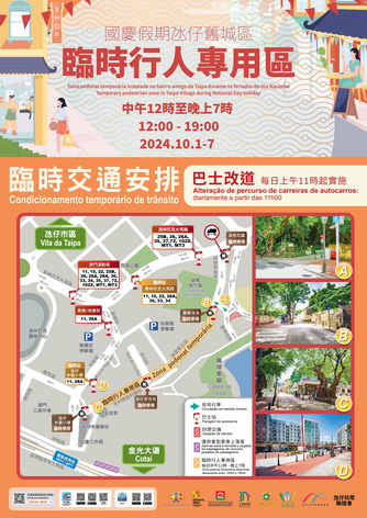【本報消息】國慶假期間,氹仔舊城區市面的人流及車流預計較為繁忙,經收集聽取氹仔居民、社團及商會的意見,以及深入分析今年農曆新年實施臨時行人專用區的情況後,特區政府再次與社團合作,於10月1日至7日期間的每日中午12時至晚上七時,在氹仔舊城區設置臨時行人專用區。