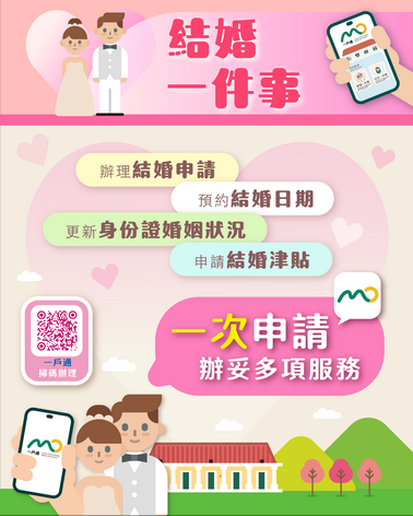 「結婚一件事」服務讓合資格的結婚人一次過辦理結婚申請、預約結婚日期、更新身份證婚姻狀況以及申請結婚津貼的服務。倘由登記官主持結婚,更可於登記後即時更新澳門居民身份證的婚姻狀況及領取結婚證明。