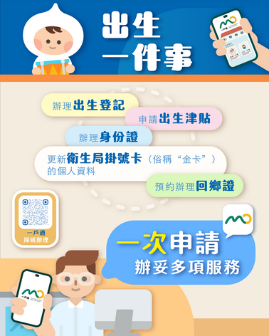 「出生一件事」則提供出生登記、辦理新生兒身份證、更新衛生局掛號卡個人資料、申請出生津貼以及預約辦理回鄉證的集成服務,讓合資格的新生兒父母一次辦妥與新生兒出生相關的多項服務,安心照顧新生兒,毋須再為辦理有關手續而奔波。