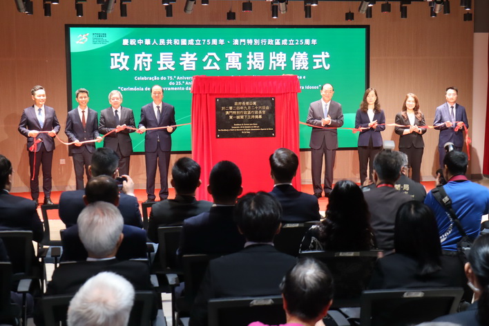 今屆政府正式拍板並動工興建的長者公寓周四下午四時舉行揭牌儀式,儀式安排在大樓二樓粵劇室內進行,行政長官賀一誠、中聯辦主任鄭新聰、社會文化司司長歐陽瑜、運輸工務司司長羅立文等官員出席並共同為長者公寓揭牌。