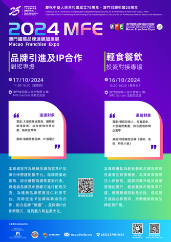 各場專題配對洽談或欲瞭解展會最新資訊可瀏覽大會網站:www.mif.com.mo或www.mfe.mo;電話:(853)2882 8711(第29屆MIF)或(853)8798 9654(2024MFE);關注微信號:MICE_IPIM。