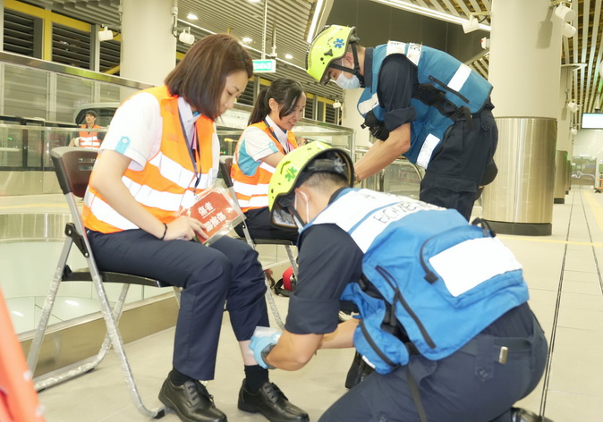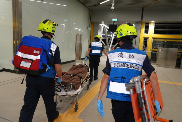 消防局接報後,立即派遣六架緊急救援車輛及23名隊員趕赴現場,按照既定行動預案進行滅火及疏散行動,並對疏散期間受傷的三名傷者進行初步護理後模擬送院治理。