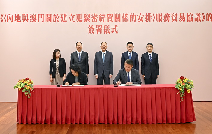 【本報消息】國家商務部國際貿易談判副代表李詠箑(副部長級)與經濟財政司司長李偉農於本月10日在澳簽署《關於修訂〈CEPA服務貿易協議〉的協議二》(《修訂協議二》),行政長官賀一誠及中聯辦主任鄭新聰見證簽署。《修訂協議二》自簽署日起生效,將於2025年3月1日起正式實施。