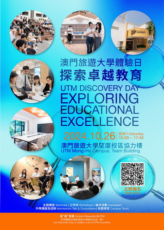 體驗日於10月26日下午3時至5時45分在旅大望廈校區協力樓舉行,活動包括創新款待及創意旅遊專題講座及工作坊、研究生課程講座、升學諮詢講座、英語互動遊戲及校園導賞,呈現旅大豐富多元的課程設置及校園生活。詳情及報名可瀏覽(www.utm.edu.mo/s/DiscoveryDay2024),查詢可致電8598 3023或8598 1559與旅大公關範疇聯繫。