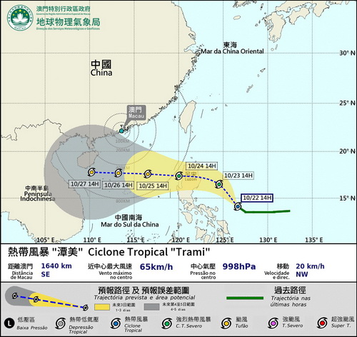 根據氣象局資料,周二下午二時熱帶風暴「潭美」正集結在西北太平洋,位於本澳東南約1,640公里處(約北緯14.1度,東經126.6度),以時速約20公里向西北方向移動。預計「潭美」將於周五加強為颱風,周四至周五進入本澳800公里範圍,大致移向海南島一帶,屆時氣象局將會適時發出熱帶氣旋信號。